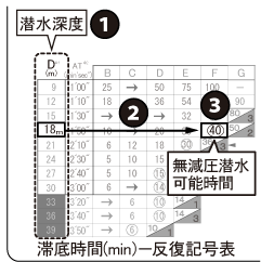 ●潜水深度や潜水時間に、ぴったりと一致する数字がない場合には、安全のために次に大きな数字を使います。