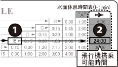 【表2】水面休息時間表で、ダイビングが終了してからどのくらいの時間が経てば、飛行機に搭乗することができるか調べます。