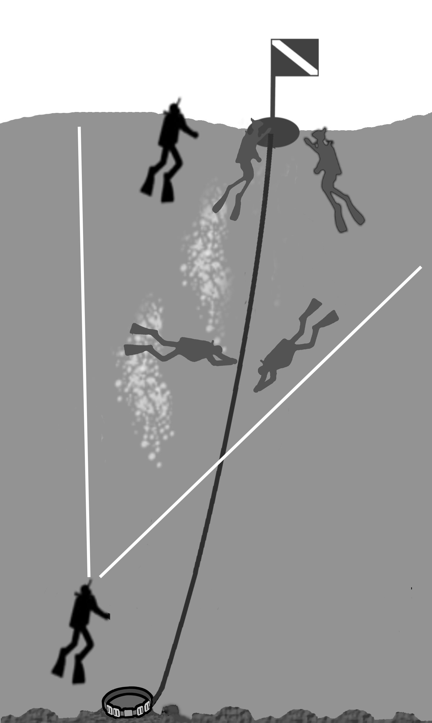 リーダーは、潜降ロープを中心とした狭い視界内で、潜降ロープに沿っているバディ1と水面フロート周りに待機するバディ2の動静確認します。