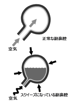 副鼻腔から気道に通じる管は、通常は何もしないでも圧平衡がとれます。 しかし、体調が悪く管が炎症をおこしてしまっている時は、管がふさがっている為、圧平衡をとる事ができません。 副鼻腔がスクイーズになると周りの組織を内側に引っ張り、痛みが生じます。